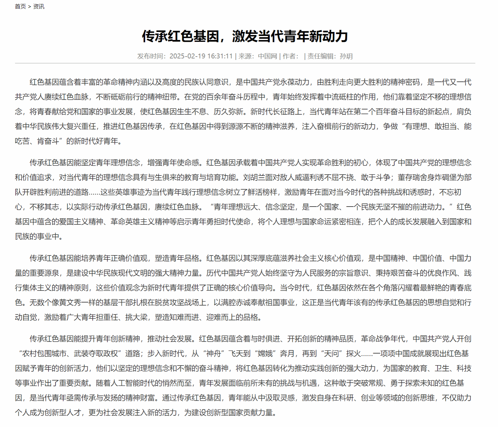 文章指出,传承红色基因不仅是铭记历史、以史为鉴之责,更是激发青年新动力、回应时代召唤之需。传承红色基因能坚定青年理想信念,增强青年使命感;传承红色基因能培养青年正确价值观,塑造青年品格;传承红色基因能提升青年创新精神,推动社会发展;传承红色基因能增强青年文化认同,提升文化自信。