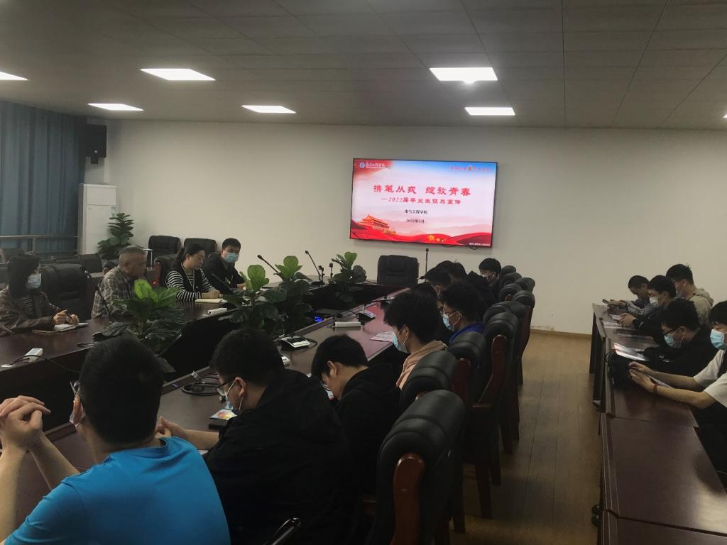 “携笔从戎锤炼男儿本色,建功军营忠诚报效祖国”。为积极推动我院大学生征兵入伍工作,5月6日下午,我院在电气楼B304会议室开展2022年毕业生征兵工作动员会。学院党委书记高週全、分管学生工作副书记唐玉娟、全体辅导员、毕业班班主任、毕业生代表等40余人参加会议。