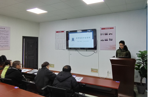 会上,周正华老师分享了“品学兔”奖学金的创办理念。唐玉娟书记就评审办法、程序等作了说明后,参评学生分别从学习成绩、获奖情况和课外实践等方面进行现场答辩,通过各位老师现场打分,最终确定韩旭等10名同学获得“品学兔”奖学金。