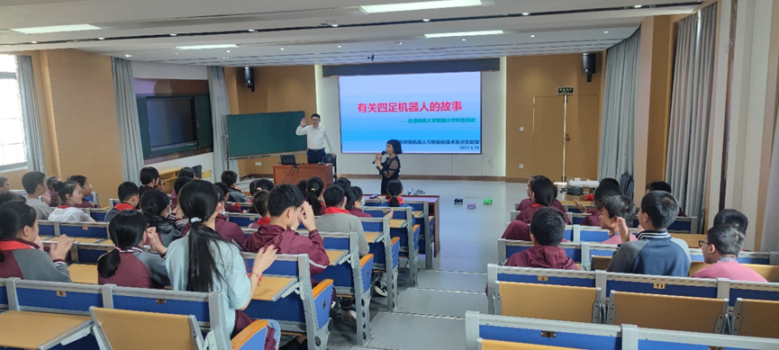 2023年4月20日,南昌市焊接机器人与智能化技术重点实验室深入南昌大学附属小学开展了主题为“有关四足机器人的故事”的科普活动。该活动吸引了百余名小学生和教师前来参加。