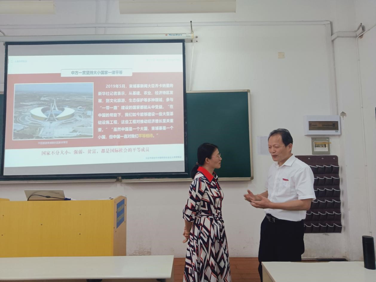 课后,张兴旺与任课老师进行了沟通交流,张兴旺充分肯定了尹老师的授课水平和教学效果,认为尹老师对教学内容熟悉、能够结合国情和中华优秀文华来讲解、课堂秩序良好、师生互动良好。课后,张校长与任课老师进行了良好的沟通交流,并从教学效果方面上提出了有益的建议。希望尹晶晶老师不断提升思想政治理论课的思想性和理论性和实效性,切实发挥思政课在大学生思政教育中“立德树人”的重要作用。(文/图 盛晓春)