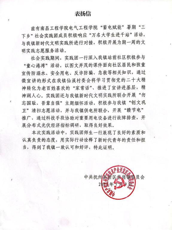 7月3日-7月9日,电气工程学院“蓄电赋能”暑期“三下乡”社会实践团队组织师生一行赴抚州市高新区崇岗镇开展了为期七天的文明实践活动。