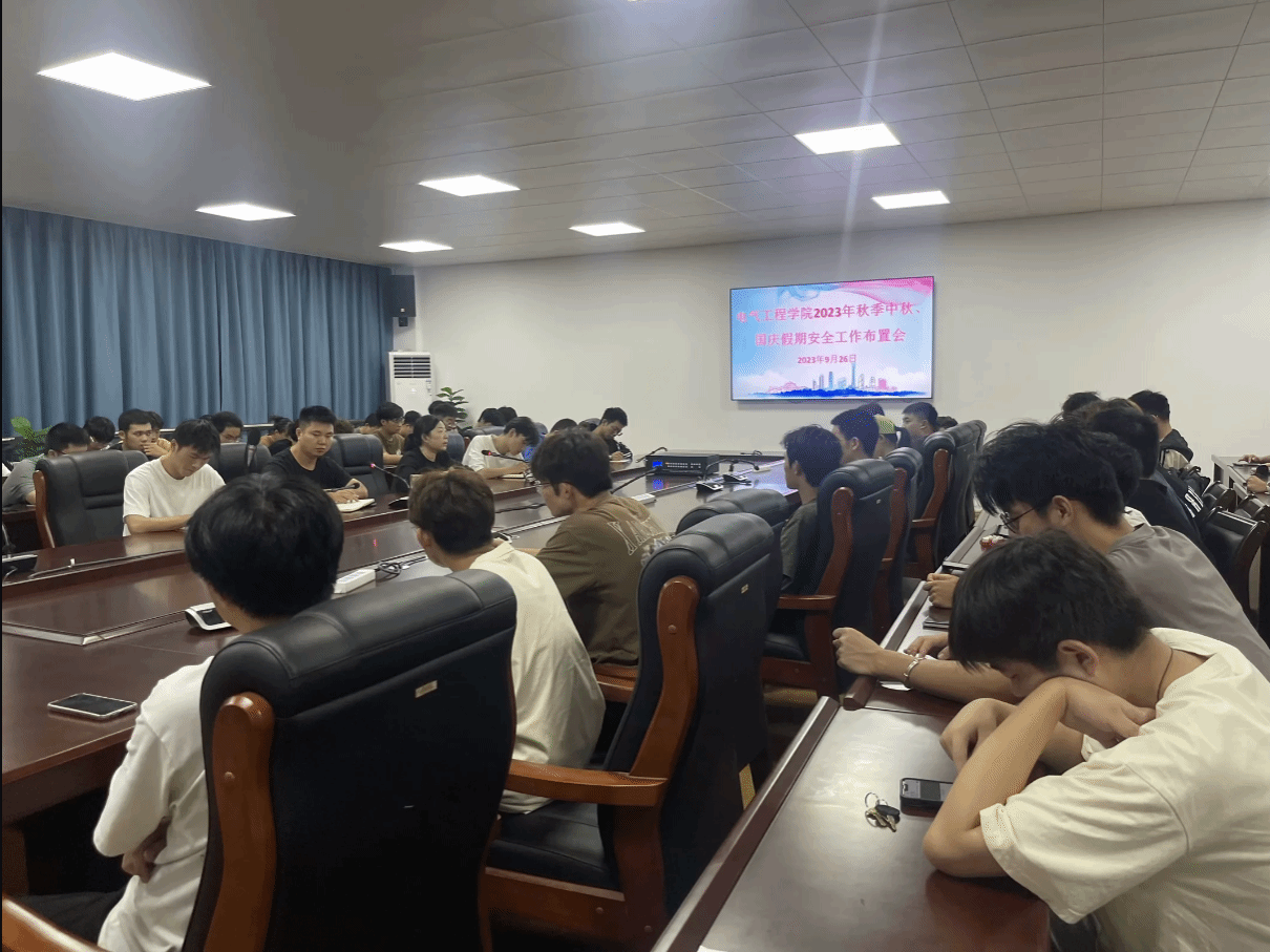 9月26日下午,电气工程学院在电气楼B303会议室召开2023年秋季国庆、中秋“双节”假期安全工作部署会议。学院党委副书记唐玉娟、全体辅导员,各班级团支书、副团支书(班长),院学生会各部门代表等70余人参加了会议。