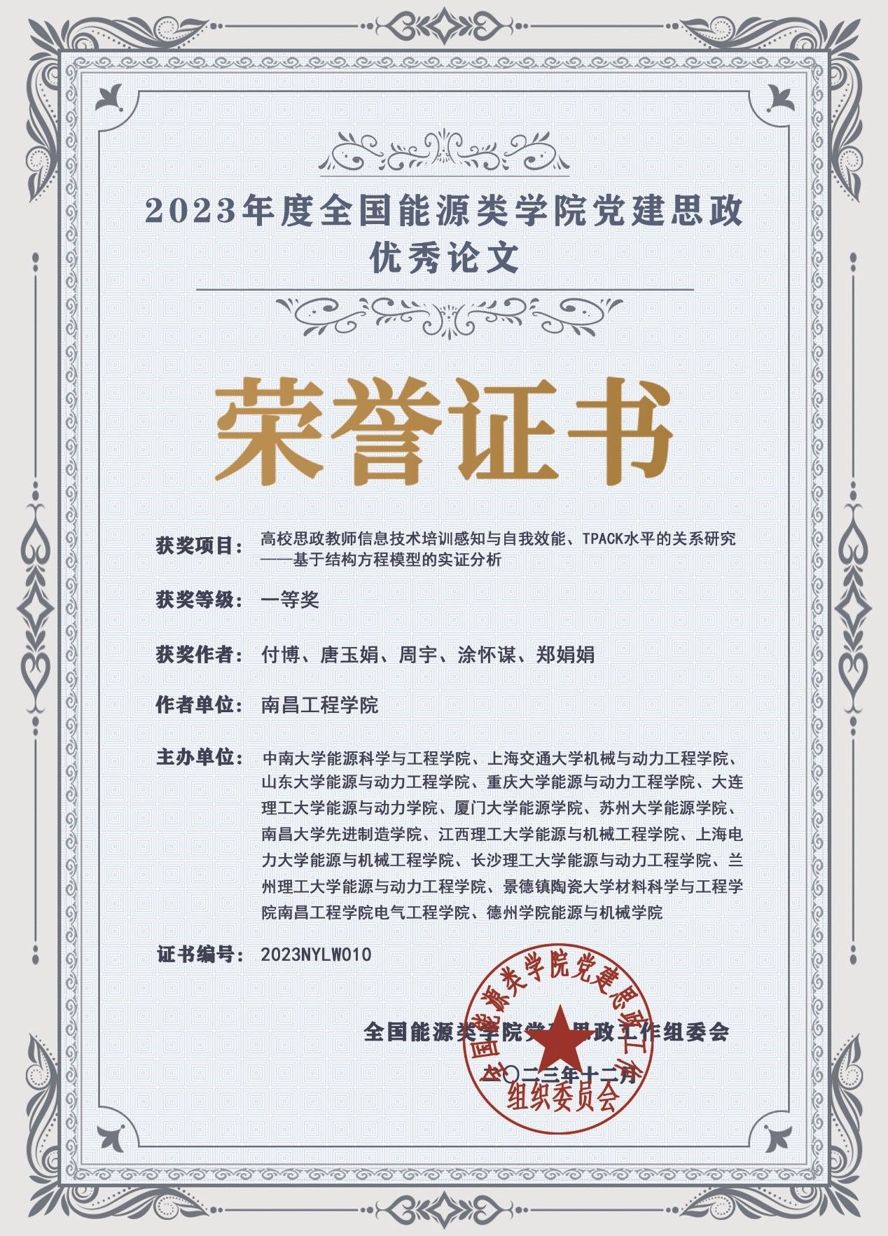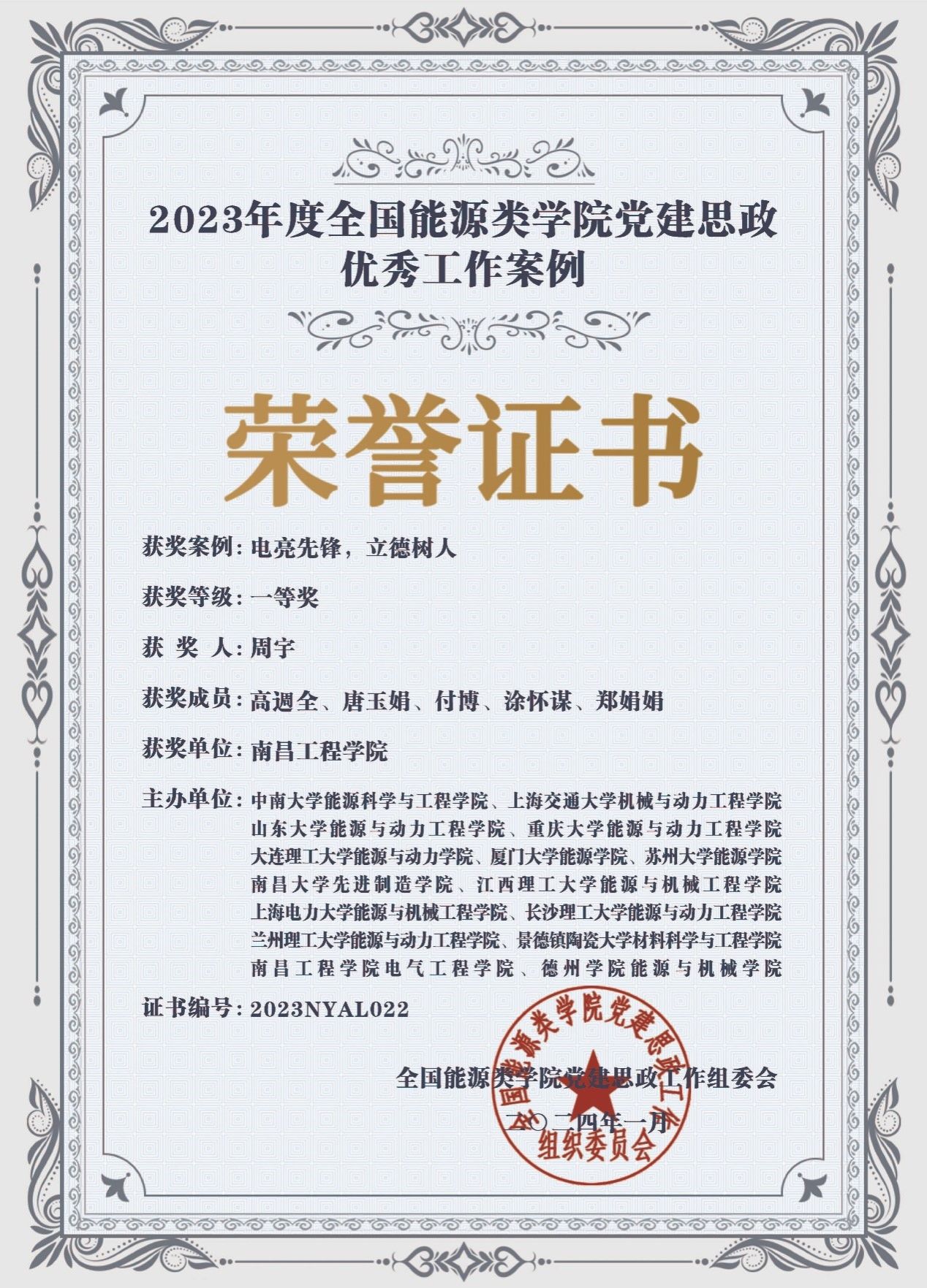 据悉,此次2023年度全国能源类学院党建思政优秀论文及优秀工作案例评选由中南大学,上海交通大学,山东大学,重庆大学,江西理工大学等多所高校能源类学院联合发起,共有50余所高校300余件作品参评,旨在不断开创新时代高校能源类学院党建思政工作新局面,提升能源类学院党建思政水平和工作实效。南昌工程学院电气工程学院始终坚持在辅导员理论研究方面下工夫,扎实推进研究成果培育,助力辅导员思想政治教育工作提质增效,全面提升学院思想政治教育质量与育人水平。(图/周宇 文/付博)