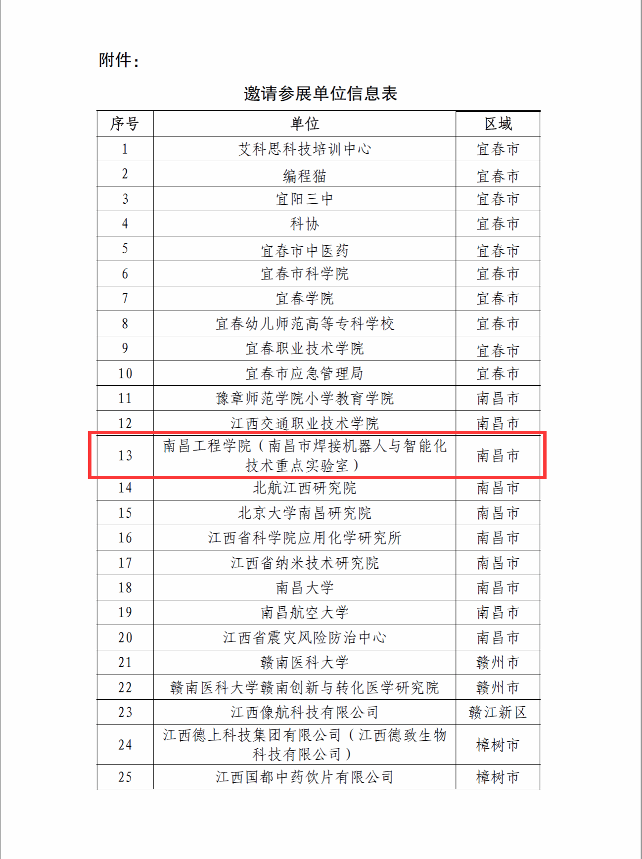 2024年5月25日,以“弘扬科学家精神,激发全社会创新活力”为主题的江西省科技活动周主场开幕式在宜春举行。本届科技活动周由江西省科学技术厅、江西省委宣传部、江西省科学技术协会和宜春市人民政府联合主办。我校所属的南昌市焊接机器人与智能化技术重点实验室受邀参展。
