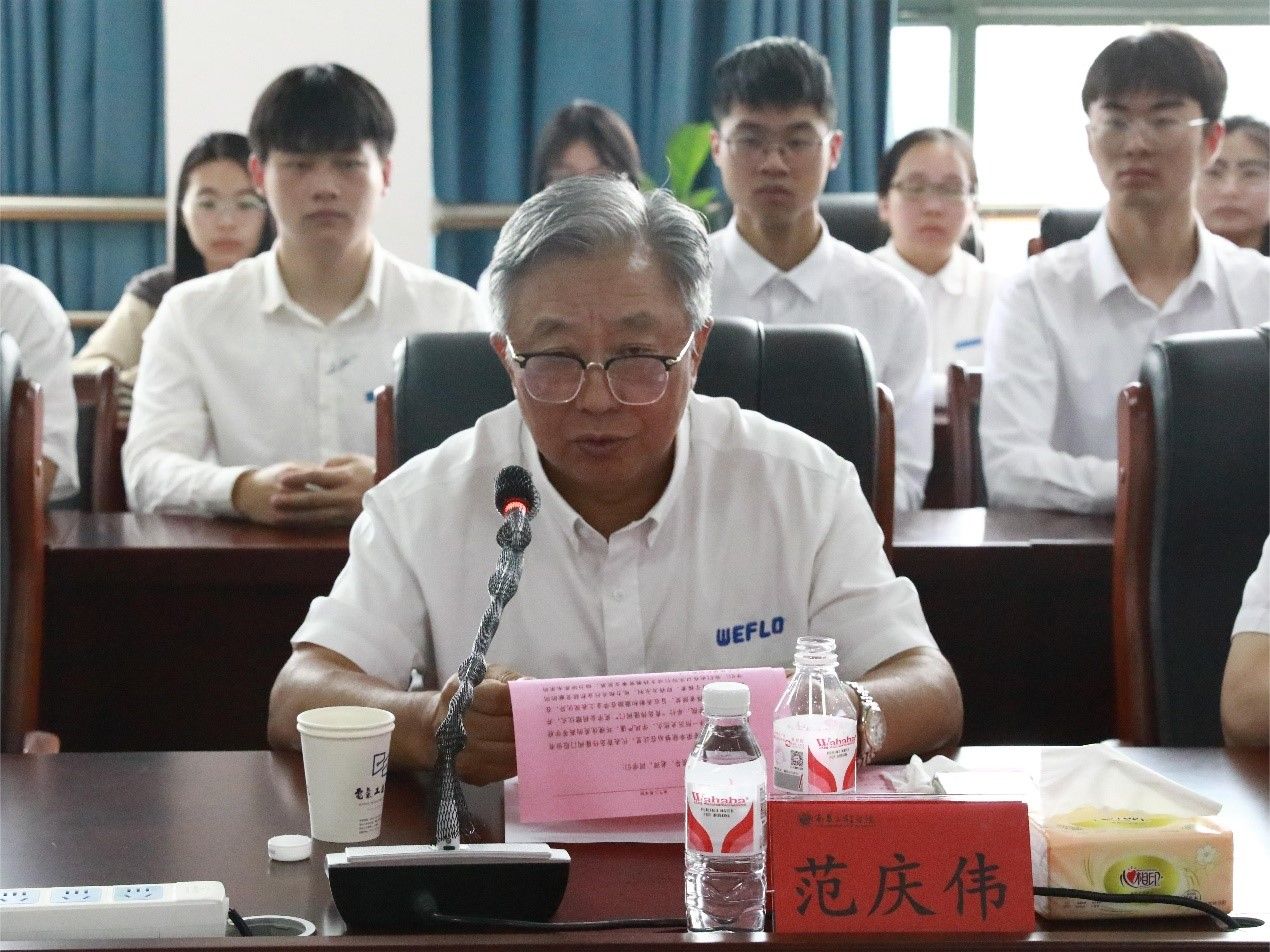 吴泽俊对青岛伟隆阀门股份有限公司对学校教育事业的慷慨支持致以最诚挚的谢意,并向青岛伟隆阀门股份有限公司颁发了捐赠证书;青岛伟隆阀门股份有限公司董事长范庆伟先生向电气工程学院颁发了捐赠牌;奖学金获奖学生代表2020级电气工程及其自动化李欣诺同学发表了感言。
