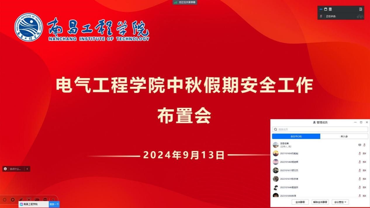9月13日,电气工程学院通过腾讯会议开展2024年中秋假期安全工作部署会,各班级团支书,院学生会各部门代表等50余人参加了会议。