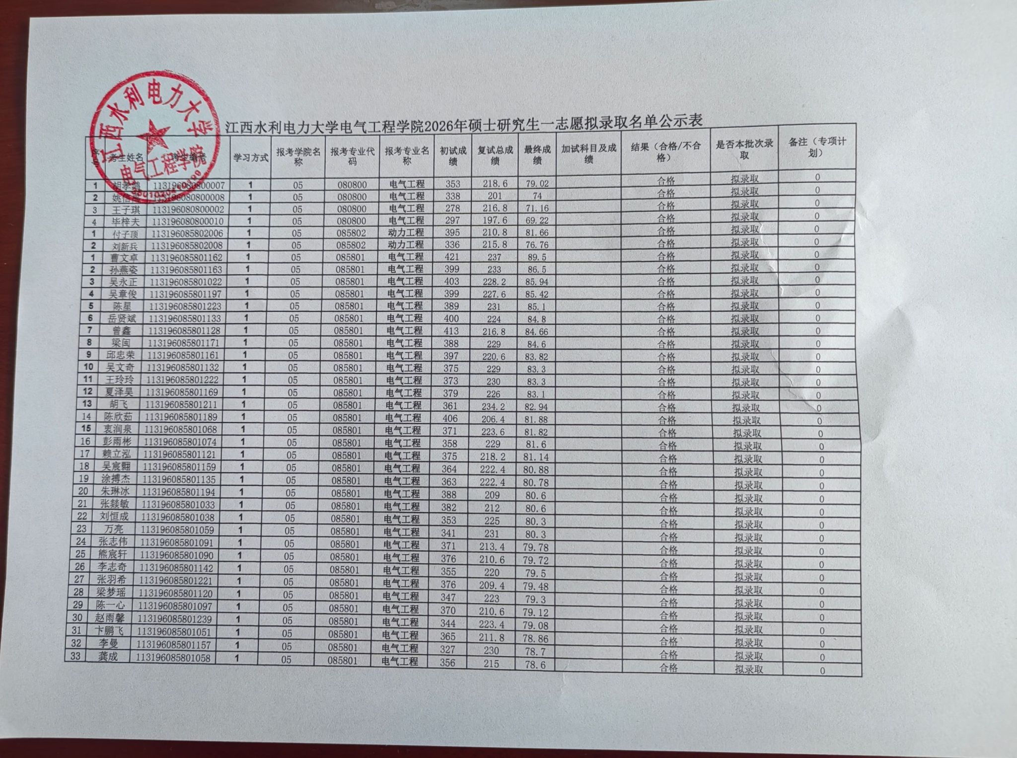 江西水利电力大学电气工程学院2026年硕士研究生一志愿拟录取名单公示表